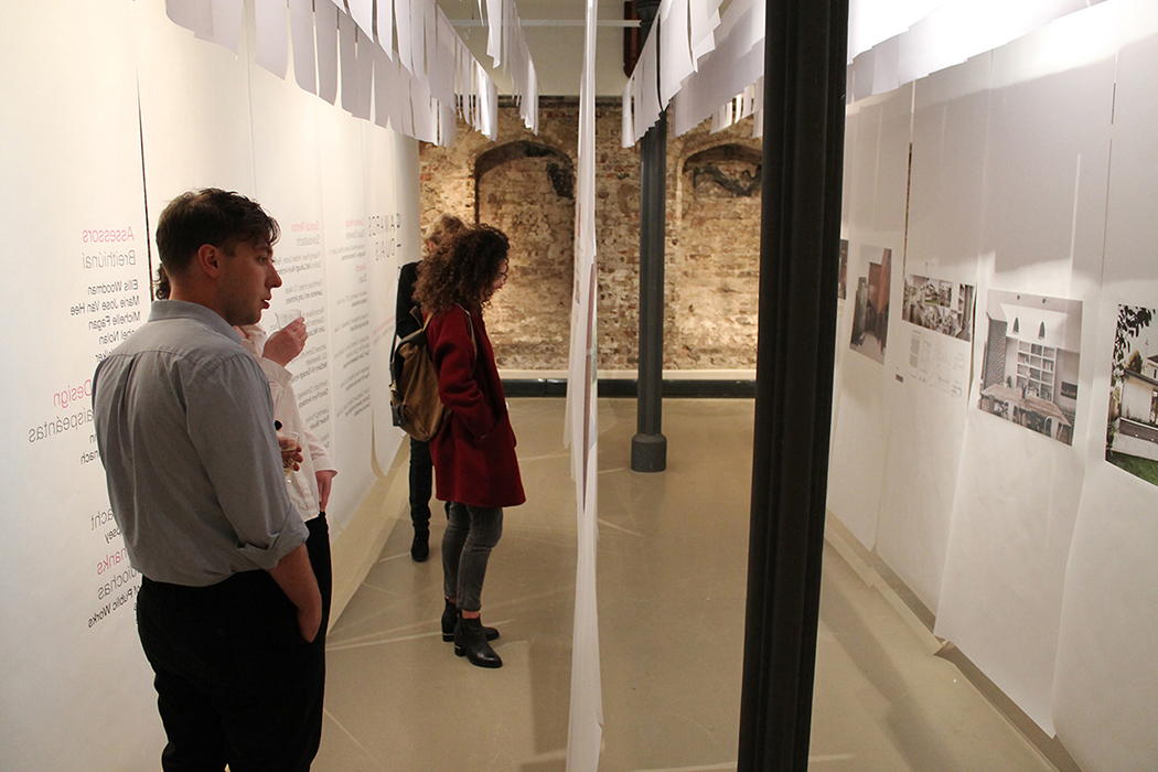 We decided to suspend the exhibition centrally off galvanised wires so as not to cover the beautiful brick walls. Presentation sheets were folded over these wires to maintain a minimalistic look. The exhibition is designed to be almost like a cloud within the space, one could explore it, get lost in it and become part of the exhibition. Sticking with a simple pallet of materials, we designed a way-finding podium out of paper and acrylic to compliment the hanging exhibition.